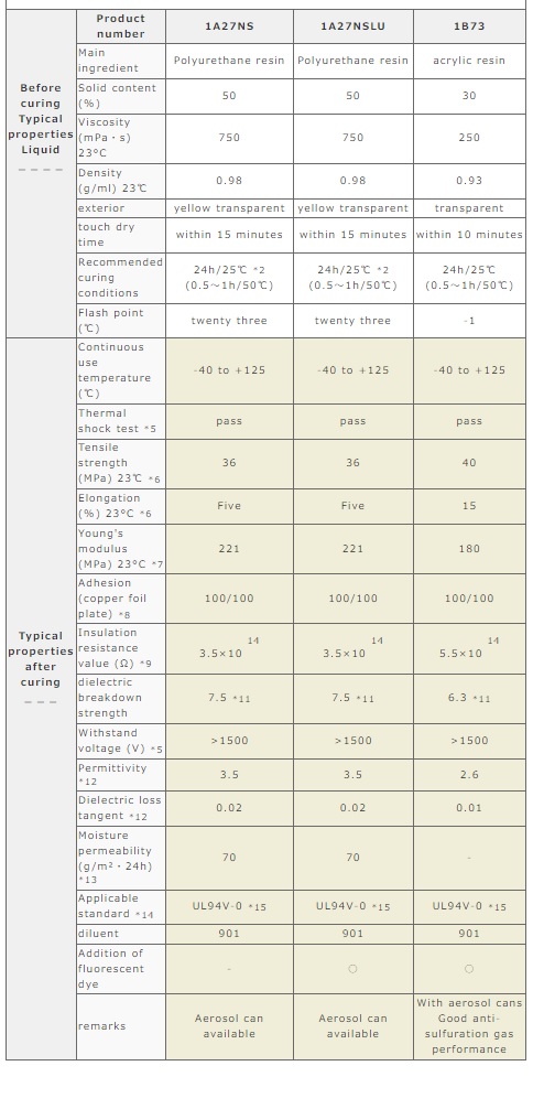HumiSeal ® is Conformal coatings developed by Chase Corp., HumiSeal Division. It is widely used for automotive substrates, electronic and electrical control substrates, etc. as a substrate insulation and moisture-proof coating with excellent moisture resistance. We also have an NS type that uses a solvent that is not included in PRTR regulations, and a VOC reduction type.